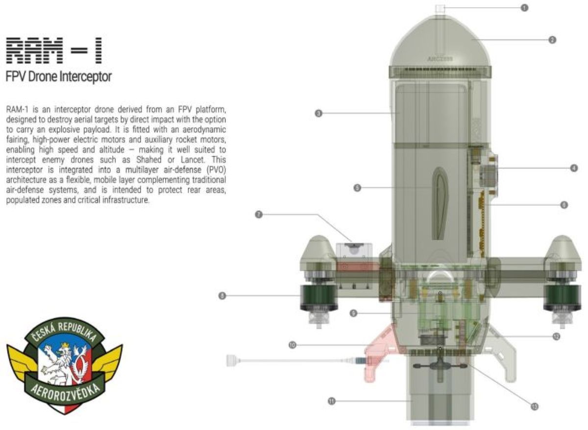 Чешская организация Aerorozvedka презентовала дрон-перехватчик ARCZ RAM-1 с автоматическим наведением (LMT), способный эффективно бороться с Shahed, Lancet и подобными ударными БПЛА.