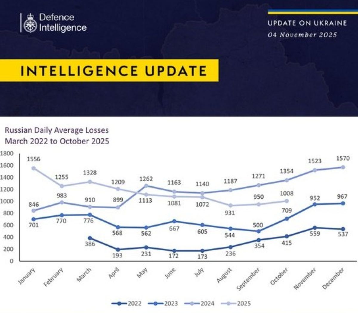 Рост ежедневных потерь — тысячи человек в сутки указывает на ожесточённость боёв и повышение активности украинских сил. Октябрь стал вторым месяцем подряд, когда этот показатель растет, что свидетельствует о неудачных попытках России захвата новых территорий.